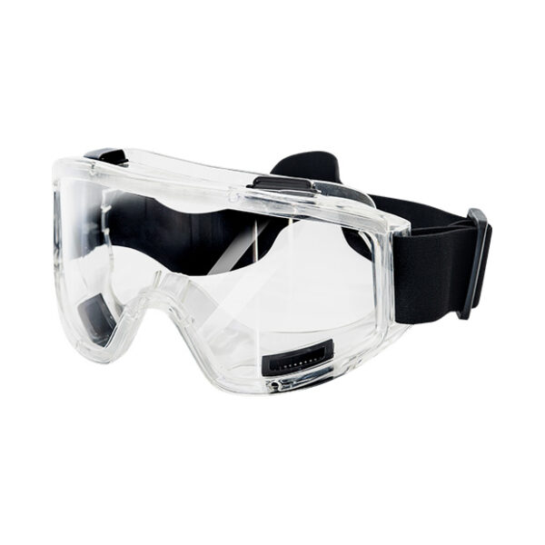 Armação confeccionada em PVC, com lente de policarbonato incolor com tratamento antirrisco e anti embaçante, possui sistema de ventilação indireta através de 04 válvulas e com elástico para ajuste ao rosto do usuário.