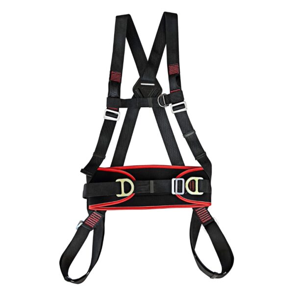 Confeccionado em fita de poliéster de 45 mm e fita secundária de poliéster de 35mm. Possui 3 pontos de conexão, sendo dois laços frontais em fita para retenção de queda, três meiasargolas em “D” confeccionadas em aço forjado, duas nas laterais do cinto para posicionamento e uma dorsal para retenção de queda. Possui 5 fivelas duplas sem pino confeccionadas em aço estampado para ajuste: Uma na cintura, duas nas pernas e duas no suspensório. Possui duas fivelas simples confeccionadas em aço forjado para ajuste peitoral.