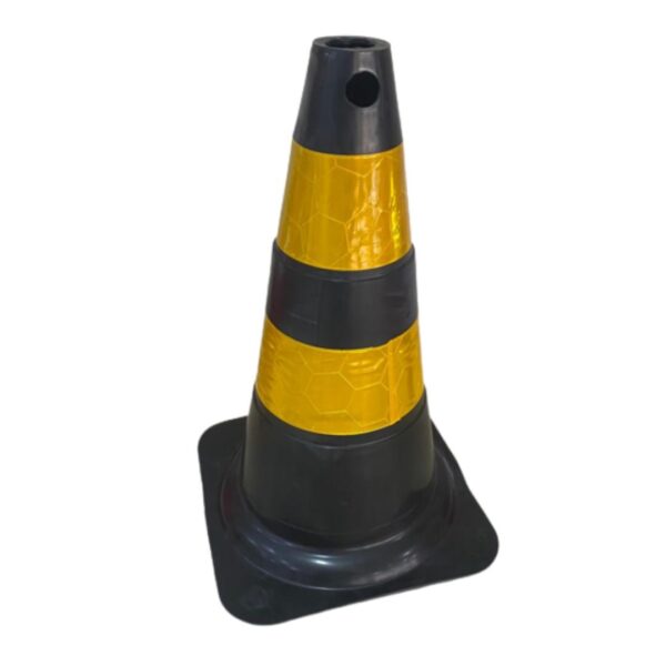 Cone injetado em PVC, possui duas faixas refletivas nas cores branca ou amarela, as faixas são confeccionadas em PVC prismático com espessura de 0,2 mm, e com forro de PVC com espessura de 0,1 mm.