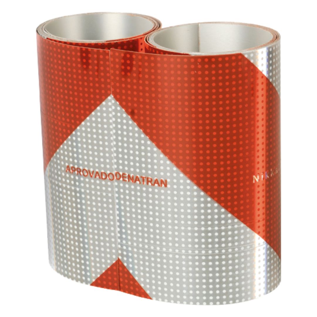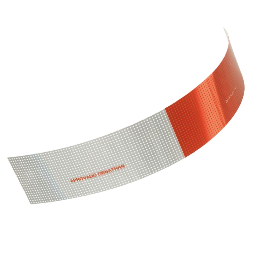 Constituída por uma superfície acrílica com micro prismático, na cor prata com vermelho, com película protetora para evitar o desgaste, e adesivo com cola de alta aderência.