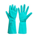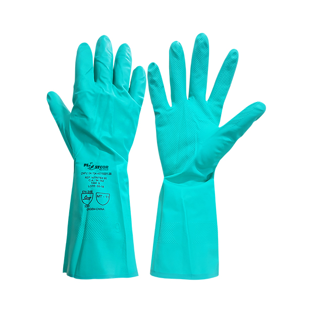 Luvas de segurança confeccionada em látex nitrílico, palma antiderrapante acabamento interno flocado.