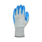 Confeccionada em fios de polietileno, elastômero, nylon, punho elástico e banho de látex natural corrugado na palma, e pontas dos dedos na cor azul.