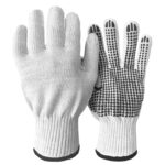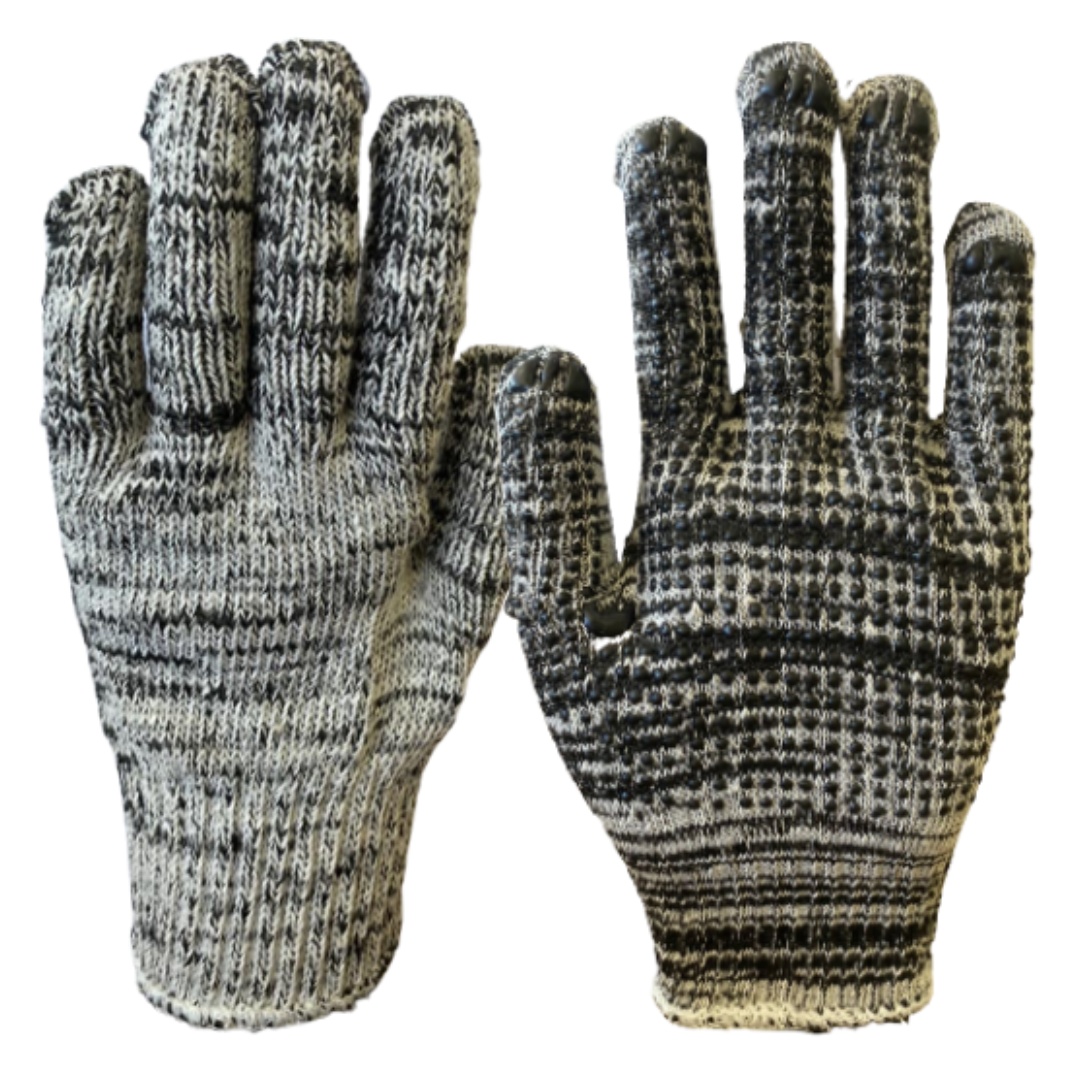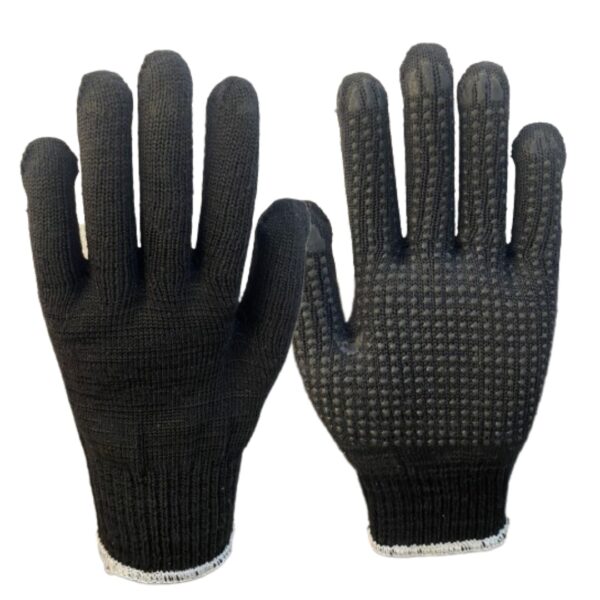 Tricotada com fios de algodão e poliéster, punho com elástico, com pigmento na face palmar e dedos, ou sem.